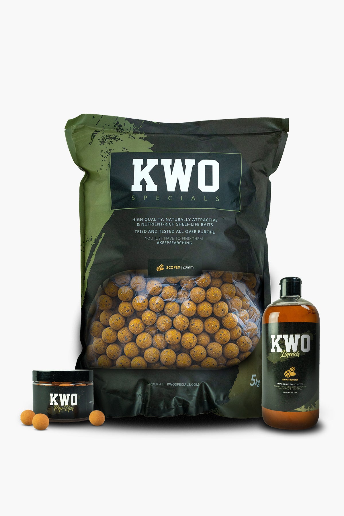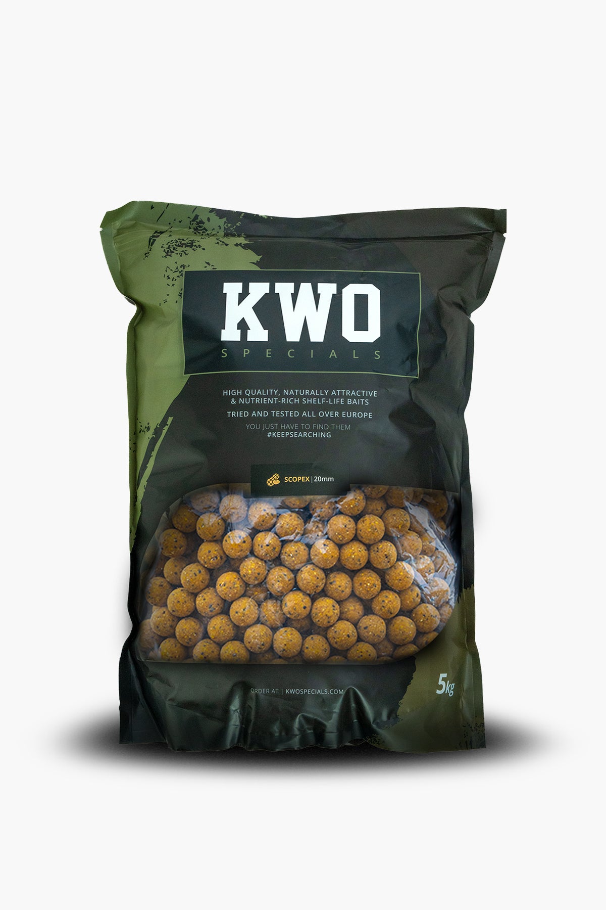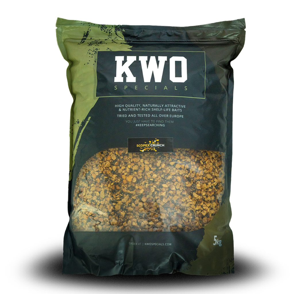 De KWO Specials zijn verkrijgbaar in drie smaken die zich al keer op keer bewezen hebben. Krill is onze eiwitbom: super attractief en perfect voor grote wateren of langere campagnes. Scopex is een echte allrounder met een romige, lichtzoete geur waar karpers het hele jaar op blijven azen. En Spice? Die is kruidig, pittig en ideaal om dressuur te doorbreken op lastige of drukbeviste wateren.